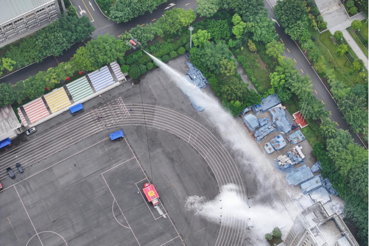 针对高层建筑火灾登高难、供水难问题,测试验证了无人机扑救高层建筑外立面火灾的能力。测试中,多家企业展示了外接供液型无人机、系留无人机消防车和大容量机载储罐型无人机。其中,外接供液型无人机可挂载40mm口径水带飞行至200米高度持续喷射灭火剂达到12分钟以上,并精准压制火点;系留无人机消防车通过将无人机与消防车进行融合,进一步提升展开速度和持续作业时间等性能;机载储罐型无人机可快速投送干粉/泡沫灭火剂,展现“空中消防员”潜力。