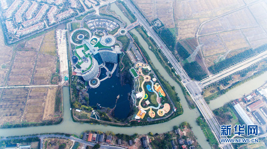 世茂深坑洲际酒店原址是一个废弃的采石矿坑,其设计一反向天空发展的建筑理念,下探地表88米,依附深坑崖壁而建。新华网吴恺 摄