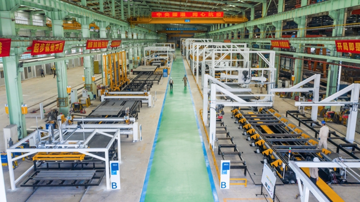 中建科工绿色科技公司生产线打通制造全阶段、全要素。作为一条智能化的钢结构模块化生产线,7个工位都能实现一键换型,实现尺寸的三维无极柔性调节,生产效率相比人工手工生产提高3倍以上。这条生产线不仅可以生产标准的海运集装箱,还能生产特种箱体,如中央援港应急医院和落马洲方舱设施项目、深圳湾区会展国际酒店项目。